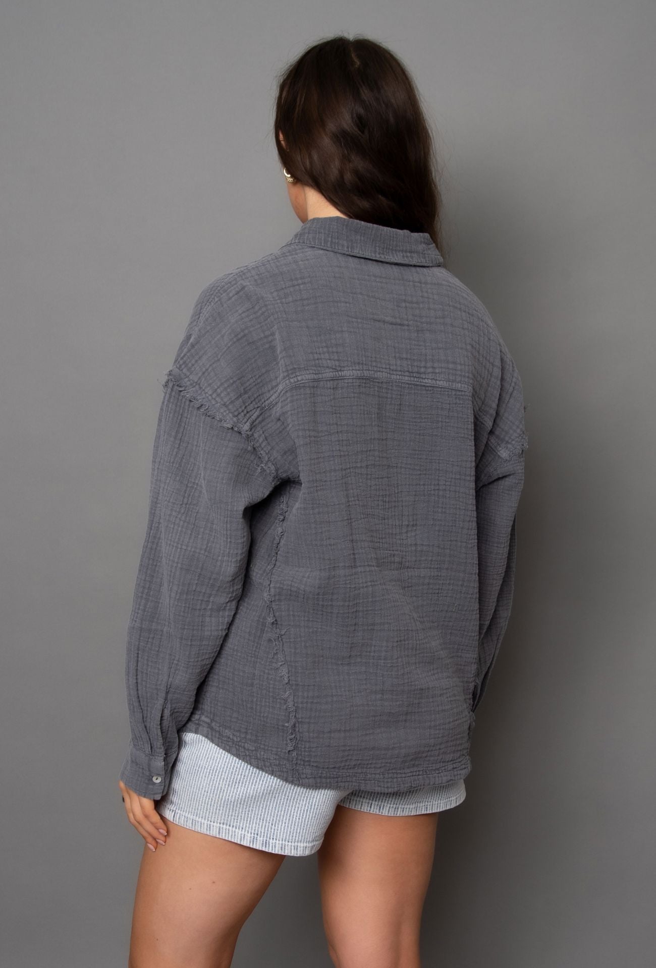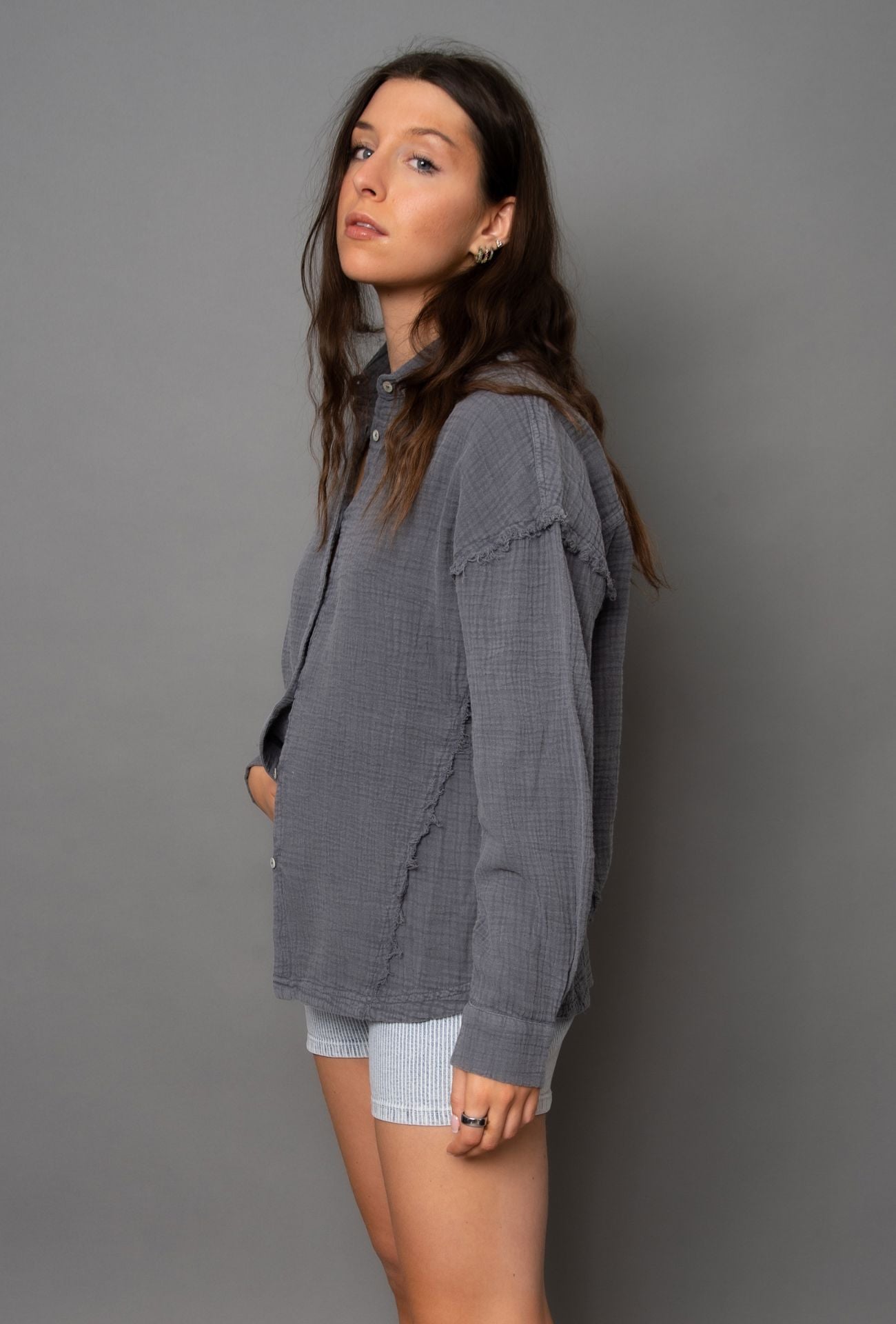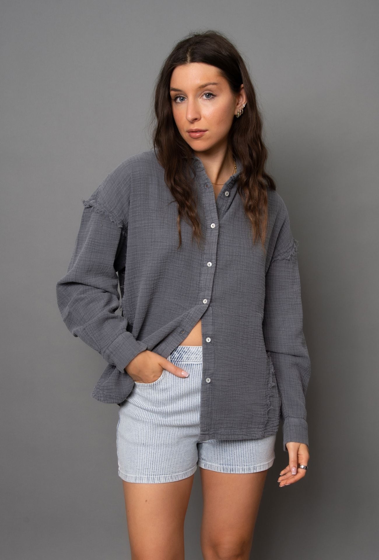 The Button Front Shirt in Grey is a relaxed staple made for easy everyday wear. Crafted from soft cotton gauze, it has a lightweight feel and effortless drape that works year-round. The button front and classic collar keep the look clean and versatile whether worn open over a tank or tucked into denim. Simple, soft, and endlessly wearable.