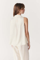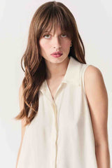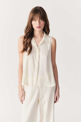 The Rachel Silky Shirt in off white is the definition of quiet elegance. Crafted from smooth, lightweight fabric with a subtle sheen, it drapes beautifully over the body for a relaxed yet refined silhouette. The sleeveless design and soft collar bring a touch of modern sophistication to any look, making it an effortless staple for every season.