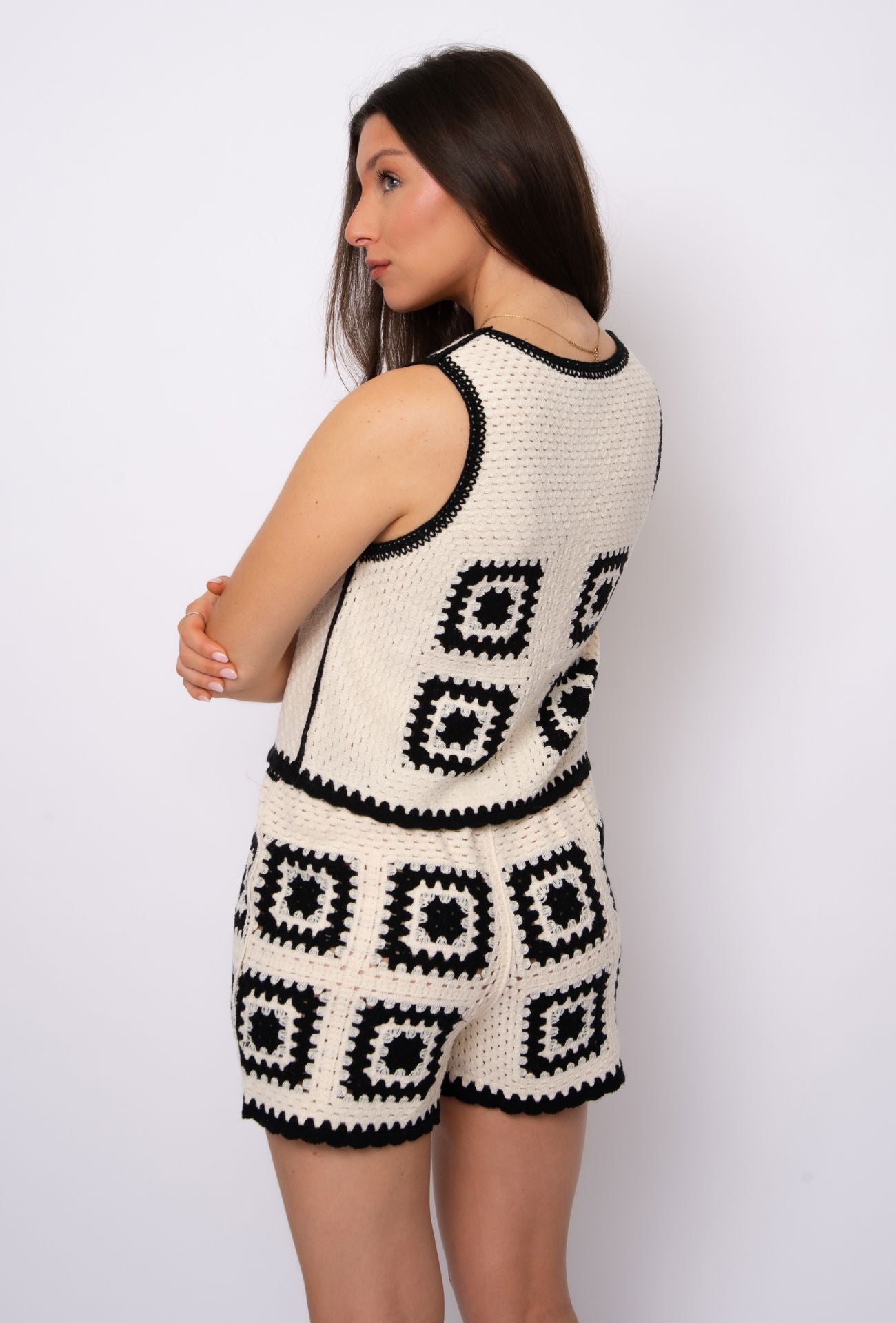 The Crochet Vest and Short Set brings a modern take on vintage-inspired style. Designed with a bold black and cream crochet pattern, this matching set includes a sleeveless button front vest and drawstring shorts for a coordinated look that’s both relaxed and statement-making. The soft open weave keeps it breathable and easy to wear all season long.